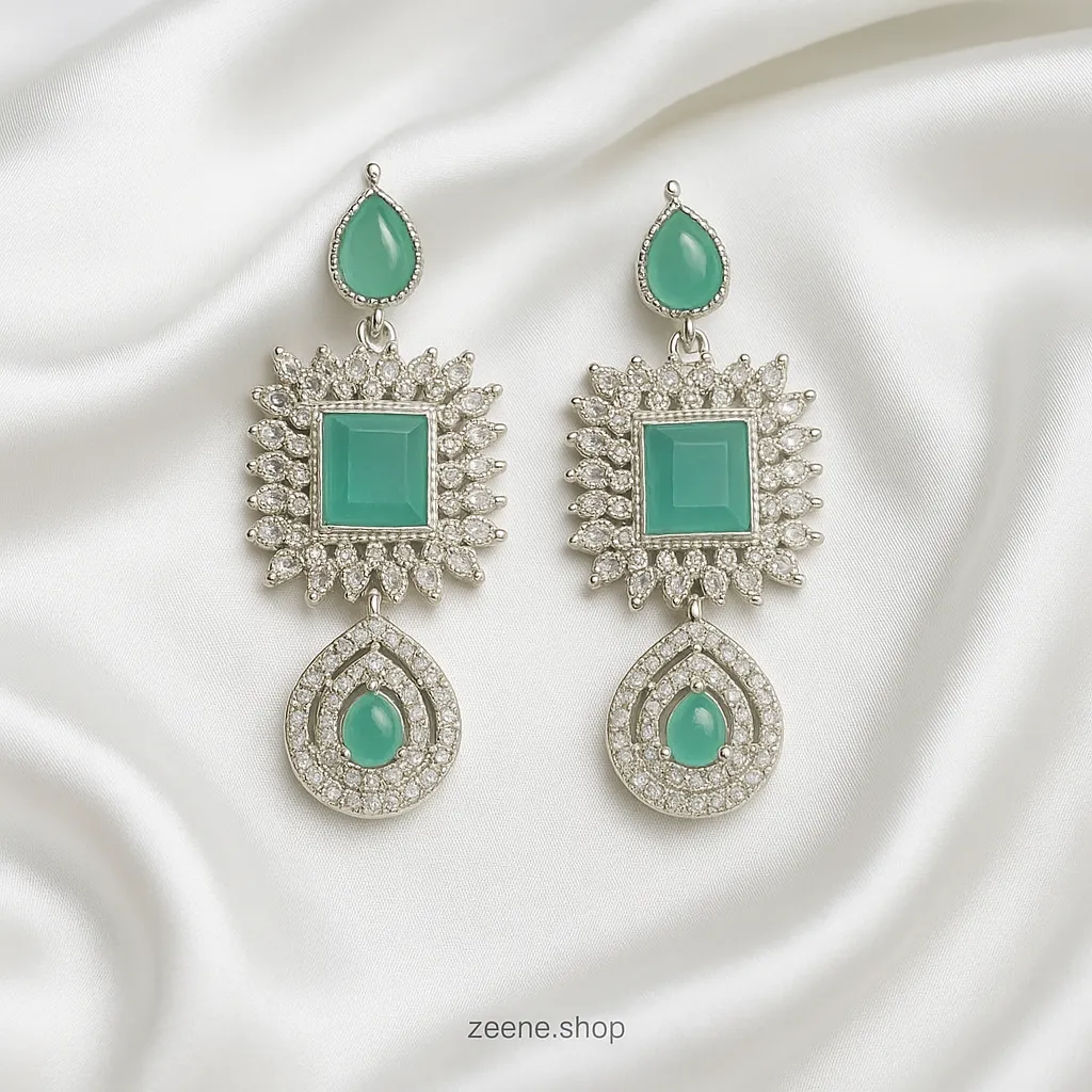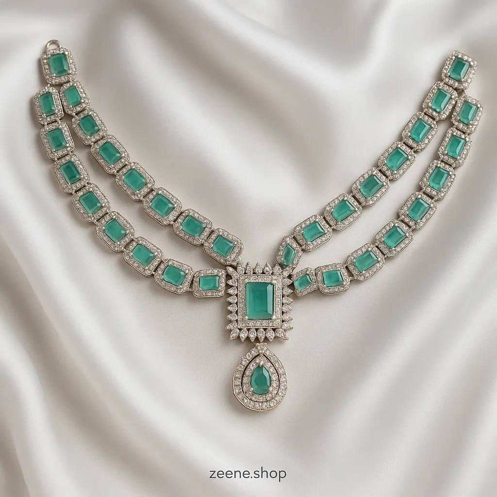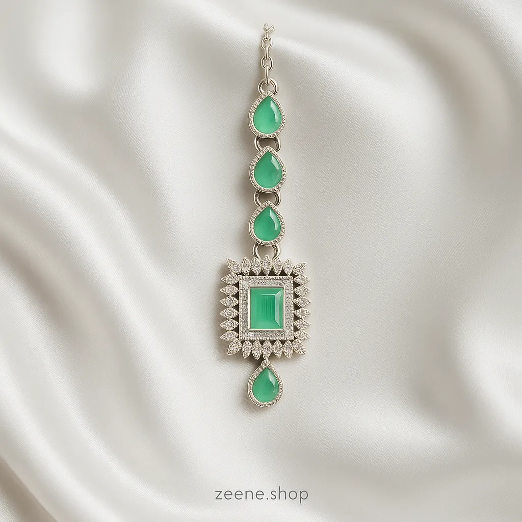Elevate your bridal elegance with this handcrafted emerald green bridal set, featuring a statement necklace, dazzling earrings, and a matching tikka. Perfect for weddings and formal events. Shop now at Zeené.